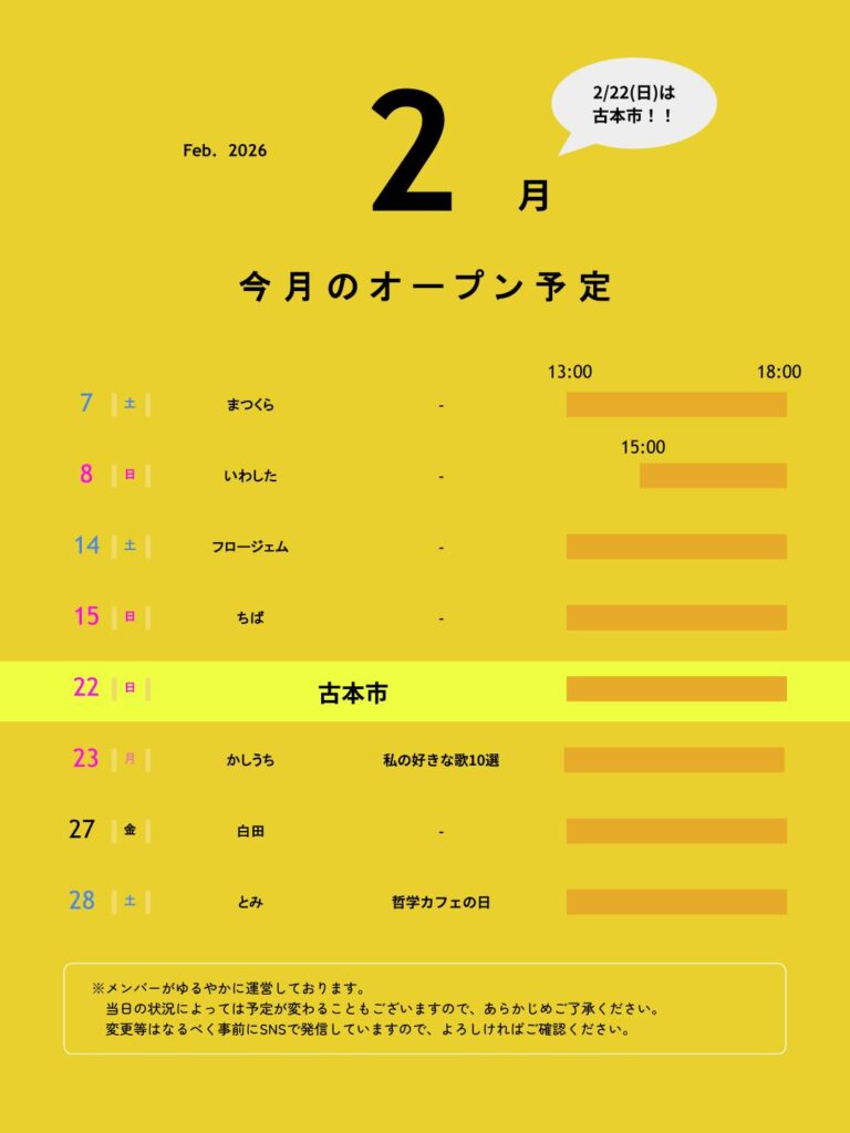 2月のオープン予定です。22日は古本市! ぜひお越しください。